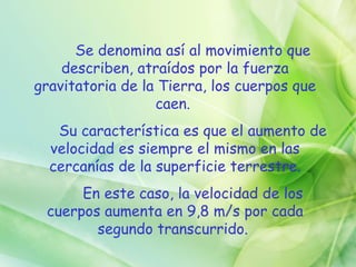 El documento describe la caída libre de los cuerpos y cómo Galileo Galilei estudió este fenómeno experimentalmente para refutar las creencias de Aristóteles. Galileo demostró que todos los cuerpos caen a la misma velocidad independientemente de su masa, y que la aceleración de la caída es constante. También estableció matemáticamente la relación entre la distancia recorrida y el tiempo en la caída libre.