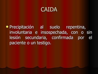 Las caídas son un problema importante en los ancianos. Entre el 15-28% de personas de 60 a 75 años y el 35% de personas mayores de 75 años caen cada año. Las caídas pueden tener graves consecuencias como fracturas, pérdida de independencia e incluso la muerte. Las causas de las caídas incluyen factores intrínsecos como problemas de visión, equilibrio y movilidad, así como factores extrínsecos como el entorno y la toma de medicamentos. Es posible prevenir muchas caídas mediante evaluaciones de riesgo,