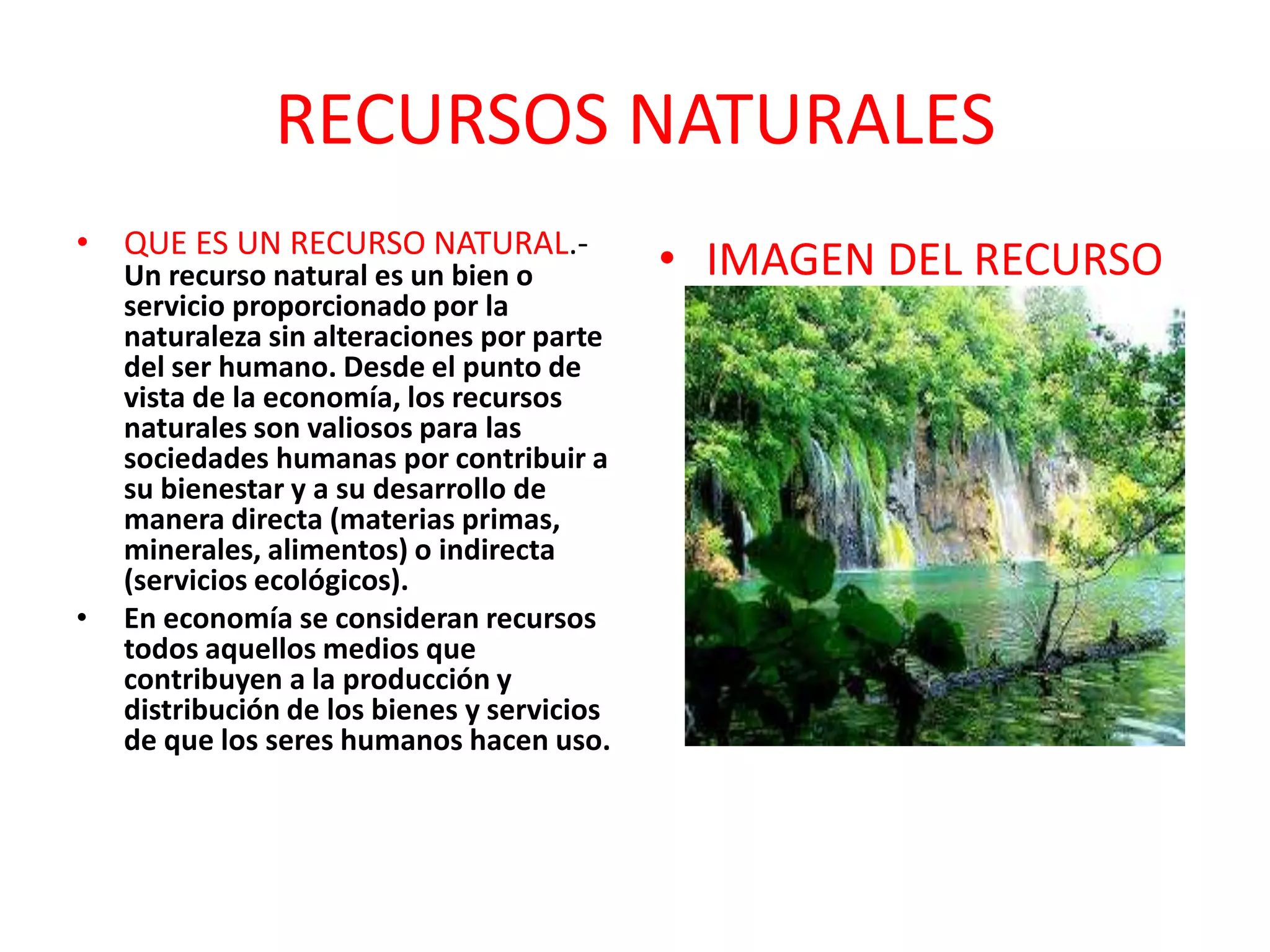 Este documento define los recursos naturales como bienes o servicios proporcionados por la naturaleza sin alteraciones humanas. Explica que los recursos naturales renovables como bosques y pesquerías pueden regenerarse si no se explotan en exceso, mientras que los no renovables como los combustibles fósiles no pueden regenerarse a escala y son finitos. Finalmente, destaca la importancia de los recursos naturales para el bienestar humano y el desarrollo económico al proporcionar materias primas, alimentos y servicios ecológicos.