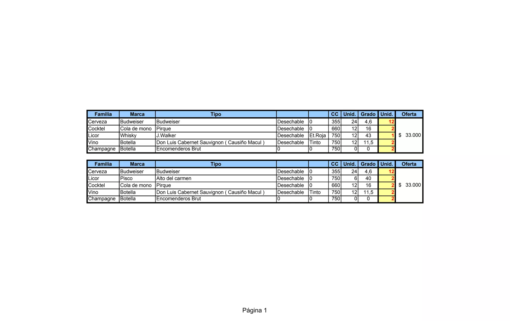 Este documento presenta una lista de bebidas alcohólicas y no alcohólicas que incluye la familia, marca, tipo, capacidad de la unidad, grado de alcohol por unidad, oferta por caja y precio. Se enumeran cinco productos en cada una de las dos tablas, que detallan cervezas, licores, cocteles, vinos y champanes.