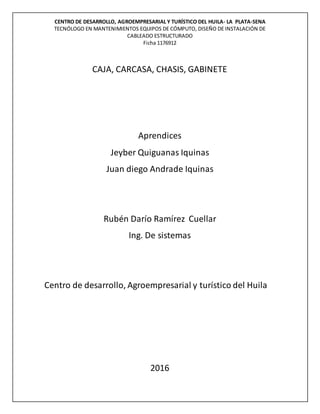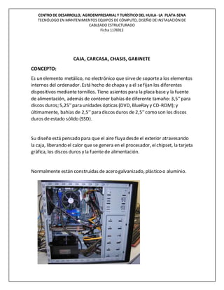 Este documento presenta información sobre cajas, carcasas y gabinetes para computadores. Describe las diferentes partes de una caja como el chasis, la cubierta y el panel frontal. Explica los diferentes formatos de placas madre como ATX, Micro-ATX, Mini-ITX y Pico-ITX. También cubre la historia y evolución de las cajas, así como los sistemas de ventilación y refrigeración.