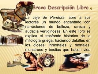 Este documento explica la mitología griega a través de la narración de dioses, inmortales, mortales, monstruos y bestias que aparecen en el libro "La caja de Pandora". Proporciona el contexto histórico detrás de los mitos griegos y describe el mundo encantado que el libro presenta a sus lectores.