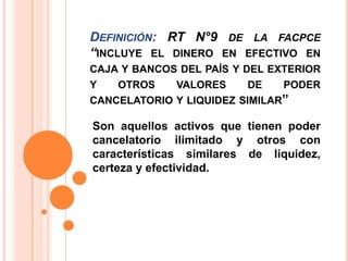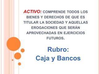 Este documento define los componentes del rubro "Caja y Bancos" dentro del activo corriente. Incluye efectivo, saldos bancarios, cheques para depositar, y moneda extranjera. También explica procedimientos como el arqueo de caja, el fondo fijo, y la conciliación bancaria para verificar los saldos.