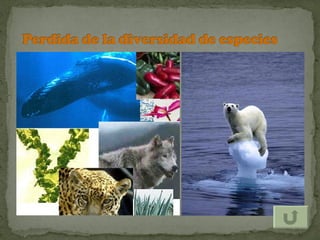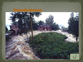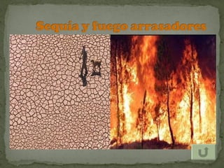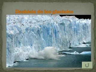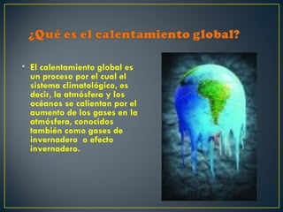 El documento describe los efectos del calentamiento global causado por el aumento de gases de efecto invernadero en la atmósfera debido a las actividades humanas. Estos gases, como el dióxido de carbono y el metano, retienen el calor en la atmósfera similar a un invernadero, elevando las temperaturas globales. El calentamiento global conducirá a sequías más severas, huracanes más intensos, derretimiento de glaciares e inundaciones costeras, así como efectos negativos en la salud humana y ecosistemas