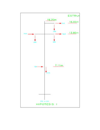 Este documento presenta cálculos para determinar las fuerzas en los soportes de una línea de transmisión de 60 kV. Calcula distancias mínimas, fuerzas del viento, pesos y ángulos de oscilación. Luego determina los momentos flectores y fuerzas equivalentes bajo tres hipótesis de carga para concluir que se requiere un poste de concreto armado de 18m de longitud y una capacidad de carga de 600kg.