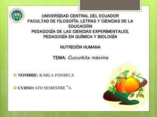 Este documento describe la Cucurbita máxima (zapallo gigante), una hortaliza nativa de los Andes. Pertenece a la familia Cucurbitaceae y se cultiva principalmente en valles tropicales y subtropicales de Ecuador. Tiene un alto contenido nutricional con vitaminas, minerales y fibra. Tradicionalmente se usa en la cocina ecuatoriana y también tiene propiedades medicinales como antiinflamatorio, laxante y para tratar la próstata.