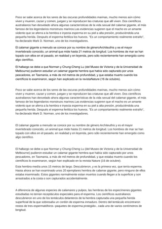Los científicos descubrieron que el apareamiento del calamar gigante involucra al macho inyectando paquetes de esperma directamente en la piel de la hembra a alta presión usando su largo pene, causando pequeñas heridas. Esto es la primera vez que se encuentra esperma en una hembra de calamar gigante. La hembra estudiada era inmadura con huevos no desarrollados, sugiriendo que puede almacenar esperma por largos períodos para reproducirse en las profundidades marinas donde los encuentros son poco