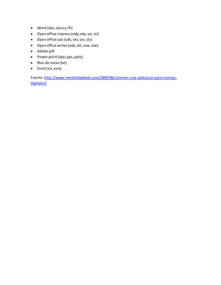 Calaméo es una aplicación web que permite crear publicaciones digitales interactivas como revistas, folletos y presentaciones. Los usuarios pueden subir archivos de hasta 100 MB en formatos como Word, PDF y PowerPoint y compartirlos en línea. El proceso de publicación es sencillo e incluye agregar un título, categoría e idioma al archivo. Una vez publicado, el contenido está disponible para que otros usuarios lo vean y comenten.