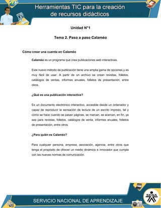 Este documento explica cómo crear una cuenta en Calaméo, una plataforma para crear publicaciones digitales interactivas. Describe los pasos para registrarse, incluyendo ingresar los datos personales en un formulario, confirmar la cuenta a través de correo electrónico, y activar la cuenta una vez dentro de la plataforma. También brinda información sobre las ventajas de las publicaciones digitales interactivas creadas a través de Calaméo.