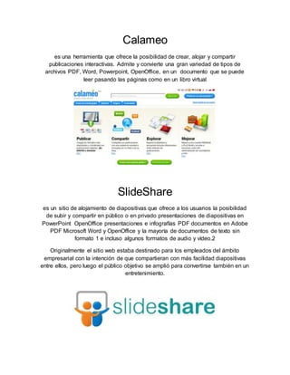 Calameo es una herramienta que permite crear, alojar y compartir publicaciones interactivas en formato de libro virtual convirtiendo archivos PDF, Word, PowerPoint y OpenOffice. SlideShare es un sitio para subir y compartir presentaciones de diapositivas, documentos PDF, Word y otros formatos de texto e incluso audio y video de manera pública o privada. Originalmente estaba destinado a empleados para compartir diapositivas fácilmente pero luego se amplió su público objetivo para también ser un entretenimiento.