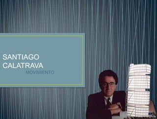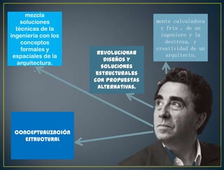 Santiago Calatrava es un arquitecto e ingeniero español cuyas obras mezclan soluciones técnicas de ingeniería con conceptos formales y espaciales de arquitectura. Sus diseños amalgaman el acero y el concreto en formas monumentales que desafían la estabilidad de los materiales y dotan a las ciudades de emblemas urbanísticos especiales. Algunas obras representativas incluyen L'Hemisfèric en Valencia, que utiliza el espejo de agua para reflejar la estructura como un o