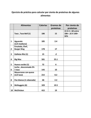 Este documento lista 10 alimentos comunes y proporciona la cantidad de calorías, gramos de proteínas y por ciento de proteínas de cada uno. Los alimentos incluyen tacos, aguacates, ensaladas, galletas, hamburguesas, huevos, leche, macarrones con queso, pan y nuggets/sandwiches de pollo. El por ciento de proteínas varía desde 5% para las galletas hasta 38% para los huevos.