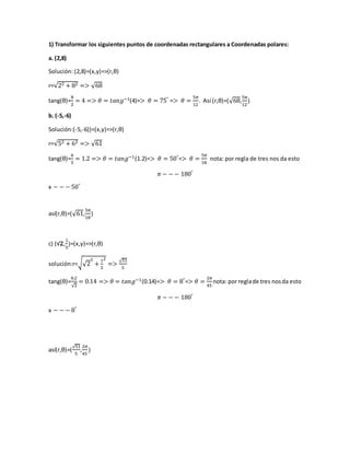 Este documento resume la transformación de coordenadas entre coordenadas polares y rectangulares. Explica cómo convertir puntos específicos entre los dos sistemas de coordenadas y resuelve ecuaciones que involucran ambos tipos de coordenadas. También calcula el área bajo una curva dada en coordenadas polares.
