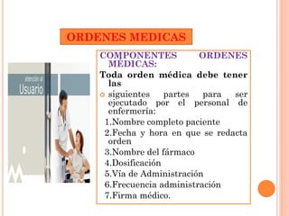 Este documento proporciona información sobre cómo calcular dosis de medicamentos. Explica que una orden médica debe incluir el nombre del paciente, fecha, nombre del medicamento, dosificación, vía de administración, frecuencia y firma del médico. También describe cómo calcular la cantidad de medicamento a administrar usando la fórmula dosis indicada x volumen = cantidad a administrar / dosis disponible. Además, explica cómo calcular la velocidad de gotas por minuto usando la fórmula número de gotas = volumen total / (3 x número de
