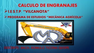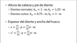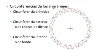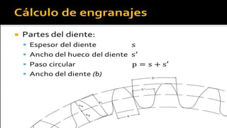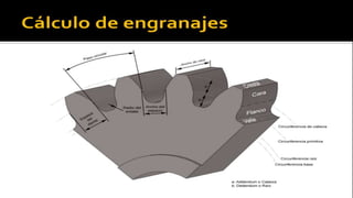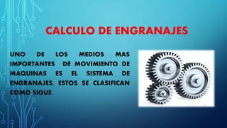 Este documento trata sobre el cálculo y diseño de engranajes. Explica que los engranajes son un medio importante para transmitir movimiento en máquinas y se clasifican en engranajes rectos, helicoidales y cónicos. Luego detalla cómo calcular el diámetro primitivo, diámetro exterior, altura de diente y distancia entre centros para engranajes rectos. Incluye ejemplos numéricos para ilustrar los cálculos.