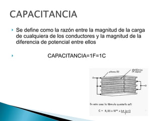 El documento resume los conceptos fundamentales de la capacitancia y cómo se calcula. Explica que la capacitancia de un capacitor depende directamente del área de las placas y de forma inversa a la separación entre ellas. También define la unidad de faradio y los submúltiplos como microfaradio y nanofaradio que se usan en la práctica. Presenta fórmulas para calcular la capacitancia en función de la carga, diferencia de potencial, área y separación de las placas.