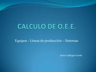Este documento habla sobre el cálculo del índice de eficiencia global del equipo (OEE, por sus siglas en inglés). Explica que el OEE mide las pérdidas en el sistema productivo mediante tres factores: disponibilidad, rendimiento y calidad. Un OEE bajo indica oportunidades para mejorar la productividad y eficiencia. El documento también incluye un ejemplo de cómo calcular el OEE para una cadena de montaje en su día de inauguración.