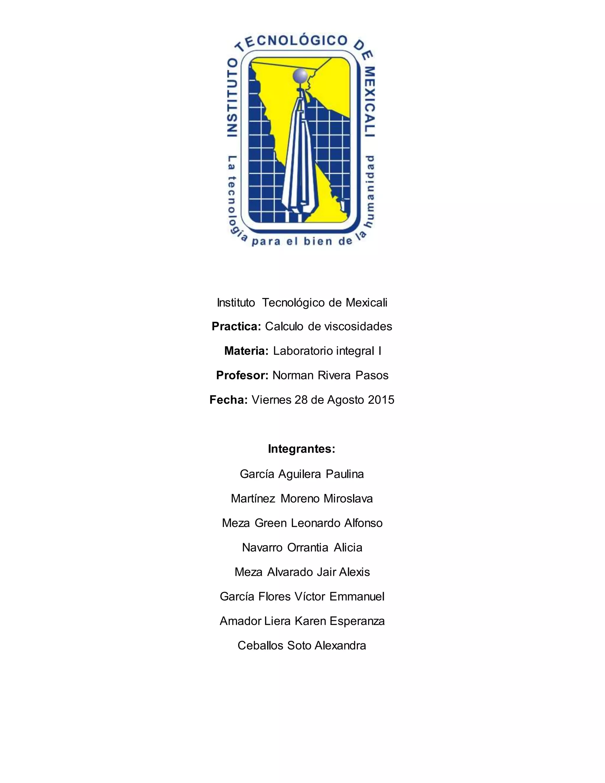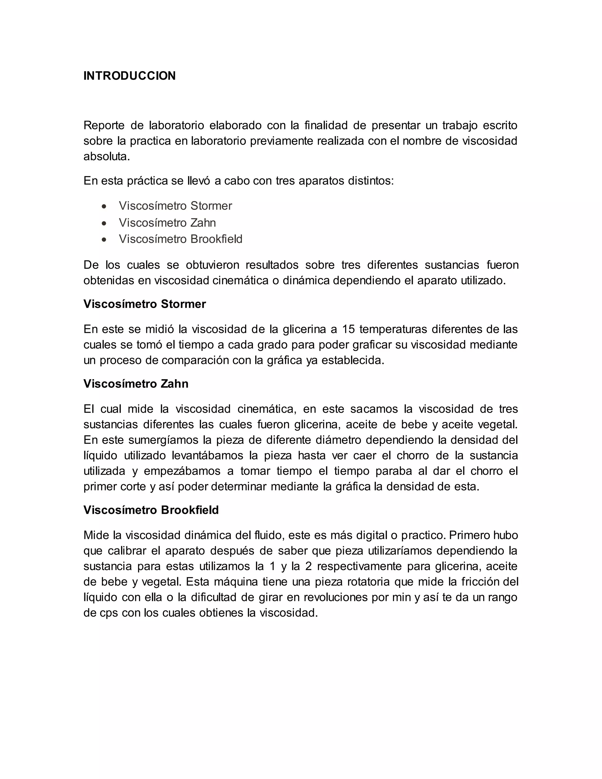 Este documento presenta los resultados de una práctica de laboratorio para medir la viscosidad de diferentes sustancias utilizando tres aparatos: el viscosímetro Stormer, el viscosímetro Zahn y el viscosímetro Brookfield. Con el Stormer se midió la viscosidad de la glicerina a diferentes temperaturas. Con el Zahn se midió la viscosidad cinemática de la glicerina, el aceite de bebé y el aceite vegetal. Y con el Brookfield se midió la viscosidad dinámica de estas tres sustancias. Los resultados mostraron los valores de
