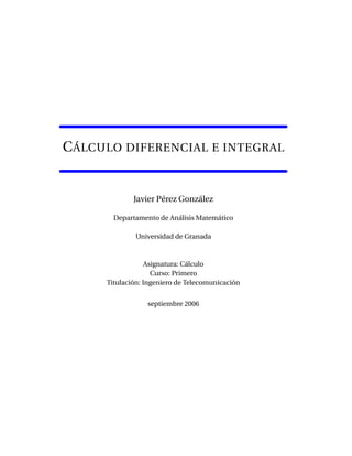 Este documento presenta un curso de cálculo diferencial e integral para estudiantes de primer año de ingeniería de telecomunicaciones. Cubre temas como números reales y complejos, funciones, límites, derivadas, integrales, series y cálculo vectorial. El objetivo es proporcionar a los estudiantes los conceptos y herramientas matemáticas fundamentales necesarios para comprender conceptos avanzados en ingeniería.
