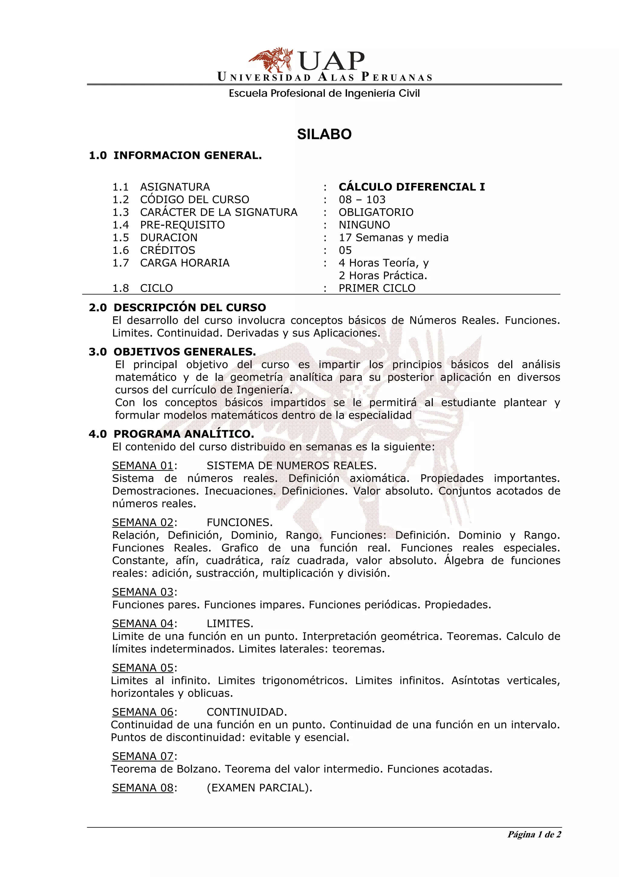 Este documento presenta el silabo de la asignatura de Cálculo Diferencial I. El curso dura 17 semanas y media y cubre conceptos básicos de números reales, funciones, límites, derivadas y sus aplicaciones. El objetivo principal es impartir los principios básicos del análisis matemático para su aplicación en ingeniería. El contenido se distribuye semanalmente entre números reales, funciones, límites, continuidad, derivadas y sus aplicaciones a maximización y minimización de funciones. La evaluación consta de un