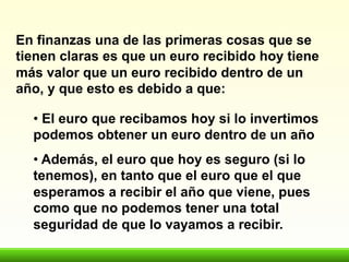 Este documento explica los conceptos básicos de cálculo financiero como el valor futuro, valor presente y rentabilidad de una inversión utilizando la herramienta Excel. Se define la fórmula para calcular el valor futuro de una inversión realizada hoy tomando en cuenta factores como el principal invertido, la tasa de interés y el número de periodos. También se explica cómo calcular el valor presente requerido hoy para alcanzar una cantidad futura dada y cómo determinar la rentabilidad de una inversión conociendo los valores invertido e recibido.