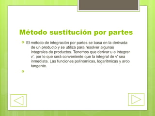 Este documento presenta los métodos de integración por partes y de integración definida. Explica que el método de integración por partes se basa en derivar un producto y se usa para resolver integrales de productos donde la integral de la derivada sea inmediata. Además, proporciona la fórmula general para la integración por partes y dos ejemplos de su aplicación. Finalmente, define la integración definida como aquella integrada respecto a ciertos límites y presenta su notación convencional.