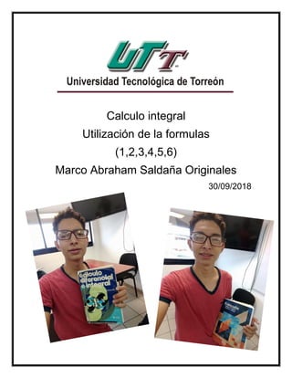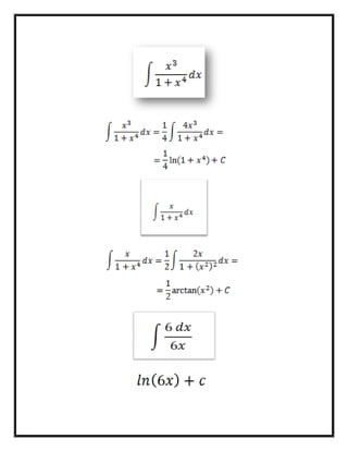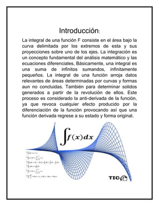 El documento presenta varias fórmulas para el cálculo integral. Explica que la integral de una función representa el área bajo la curva definida por la función entre dos límites y que es la operación inversa de la derivada. Luego enumera seis fórmulas comunes para calcular integrales definidas e indefinidas de funciones como polinomios, exponenciales, logaritmos y trigonométricas.