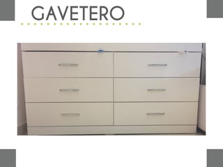 El documento describe un gavetero, incluyendo sus medidas y piezas. Calcula la cantidad de madera necesaria para construirlo y presenta el resultado del cálculo.