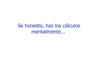 Este documento presenta una serie de ejercicios mentales breves para probar la capacidad de cálculo y atención del lector. En los ejercicios, se pide al lector que realice sumas mentales, cuente letras en un texto, y piense rápidamente en una herramienta y un color específicos. El propósito es demostrar que la mayoría de las personas piensan de manera similar, aunque un pequeño porcentaje puede ser diferente.