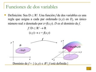 El documento presenta conceptos básicos sobre funciones de varias variables, incluyendo su definición, dominio y construcción. También presenta ejemplos de funciones que modelan costos en función de parámetros, y graficación de superficies tridimensionales mediante curvas de nivel.