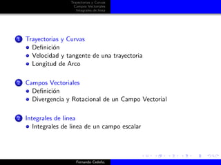 Este documento resume los conceptos de trayectorias y curvas, campos vectoriales e integrales de línea en cálculo vectorial. Define trayectorias como funciones que asignan puntos en un intervalo a un espacio vectorial, y describe cómo calcular la velocidad, tangente y longitud de arco de una trayectoria. Explica que un campo vectorial asigna un vector a cada punto en un dominio, y define la divergencia y rotacional. Finalmente, introduce el concepto de integrales de línea como una forma de integrar funciones a lo largo de trayectorias.