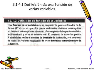 El documento trata sobre la unidad IV de cálculo vectorial, la cual cubre temas relacionados con funciones reales de varias variables como su definición, gráficas, curvas y superficies de nivel, derivadas parciales, incrementos, diferenciales, regla de la cadena, derivada direccional, gradiente, divergencia, rotacional e interpretación geométrica y física de estos conceptos, así como valores extremos de funciones de varias variables. El documento presenta estas temáticas a través de diapositivas creadas por el