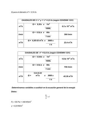 El documento presenta cálculos hidráulicos para un sistema de suministro de agua, incluyendo el cálculo de caudales, velocidades, diámetros, longitudes de tubería, pérdidas por fricción y altura manométrica total. Determina que se requiere una bomba de 25 hp para impulsar un caudal de 12.6 l/s a una altura de 68.65 metros, considerando un factor de seguridad de 1.1 en la presión de bombeo.