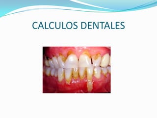 El documento habla sobre varias afecciones dentales como cálculos dentales, gingivitis, periodontitis, manchas blancas, caries secundaria y recidiva, abrasión y erosión. Describe brevemente cada una de estas condiciones dentales.