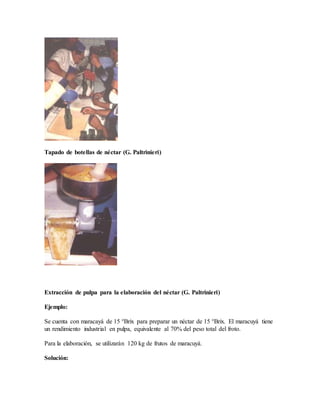 El documento describe los procedimientos para formular y producir néctares. Explica cómo calcular la cantidad de azúcar necesaria para alcanzar el grado Brix deseado mediante aproximaciones sucesivas, usando el ejemplo de un néctar de maracuyá. Luego resume los procesos para producir néctares específicos como el de aguaje, arazá y carambola.