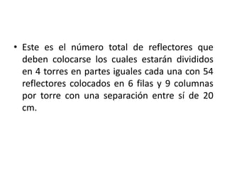 El documento calcula que se necesitan 212.70 reflectores para iluminar completamente el estadio, los cuales se dividirán en 4 torres con 54 reflectores cada una dispuestos en 6 filas y 9 columnas separados 20 cm. La instalación tendrá 3 niveles para varios tipos de actividades iluminando diferentes números de filas y columnas.