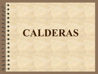 El documento trata sobre calderas industriales. Explica qué es una caldera, clasifica los tipos de calderas según su uso, presión, materiales, contenido de tubos, forma y posición de tubos, sistema de circulación y tipo de fogón. Describe detalladamente las calderas de tipo pirotubular, acuotubular y masa, e incluye diagramas de calderas pirotubulares, acuotubulares y de centrales térmicas.