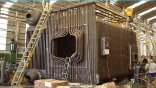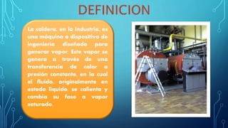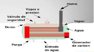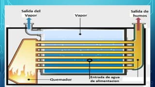 Las calderas generan vapor a través de la transferencia de calor del agua a presión constante. Existen dos tipos principales de calderas: las pirotubulares, donde los gases calientes circulan por el interior de los tubos calentando el agua en el exterior, y las acuotubulares, donde el agua circula por el interior de los tubos siendo calentada por los gases en el exterior. Cada tipo tiene ventajas y desventajas dependiendo del tamaño y calidad de vapor requerido.