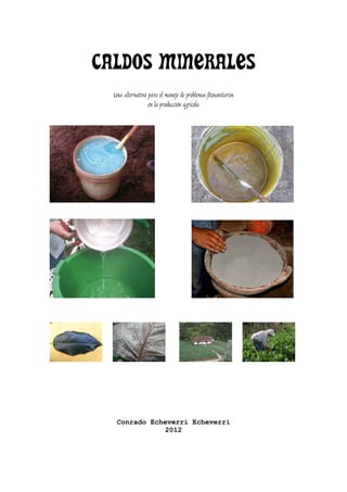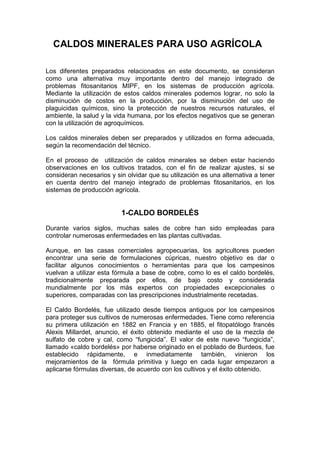 Este documento presenta instrucciones para preparar tres tipos de caldos minerales para uso agrícola: caldo bordelés, caldo sulfocálcico y caldo ceniza. Describe los materiales necesarios y los pasos para preparar cada caldo, así como sus usos para controlar enfermedades y plagas en diferentes cultivos de una manera natural y de bajo costo.