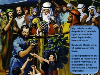 Caleb fue uno de los doce espías enviados a explorar la Tierra Prometida. A diferencia de los otros espías, Caleb confió en que Dios les ayudaría a conquistar la tierra a pesar de sus enemigos. Caleb animó al pueblo a confiar en Dios, pero la mayoría decidió no entrar en la tierra. Caleb esperó pacientemente 40 años hasta que finalmente pudo reclamar la tierra que Dios le había prometido. A lo largo de su vida, Caleb demostró una gran fe en Dios y generosidad hacia los demás.
