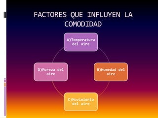 Este documento discute los factores que afectan la comodidad térmica como la temperatura, humedad y movimiento del aire. Explica conceptos como la temperatura efectiva y cómo se ven afectados por estas variables. También cubre consideraciones básicas para el diseño de sistemas de calefacción en invierno, como determinar la carga térmica requerida, calcular pérdidas y ganancias de calor, y establecer las condiciones interiores y exteriores de diseño. Incluye ejemplos numéricos para calcular