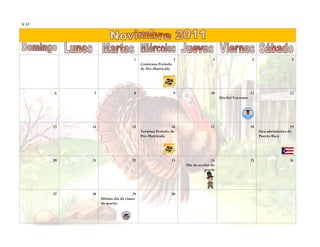 El documento presenta un calendario escolar que incluye eventos como el período de prematrícula, días festivos como el Día del Veterano y Acción de Gracias, y fechas importantes como el último día de clases antes de las vacaciones de invierno.