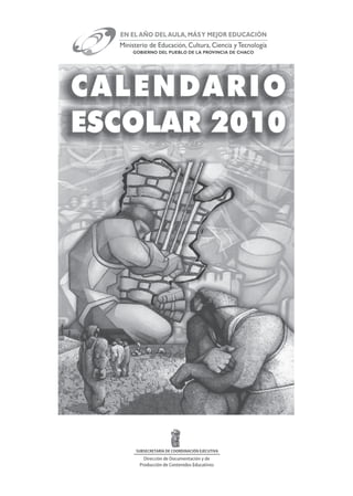 Este documento presenta el calendario escolar 2010 para la provincia de Chaco. Detalla la estructura y equipo de trabajo involucrado en su creación, así como las pautas generales, feriados, días no laborables y efemérides que se conmemorarán a lo largo del año escolar.