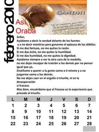 febrero 2010 Señor, Ayúdame a decir la verdad delante de los fuertes y a no decir mentiras para ganarme el aplauso de los débiles. Si me das fortuna, no me quites la razón. Si me das éxito, no me quites la humildad. Si me das humildad, no me quites la dignidad. Ayúdame siempre a ver la otra cara de la medalla, no me dejes inculpar de traición a los demás por no pensar igual que yo. Enséñame a querer a la gente como a ti mismo y a no juzgarme como a los demás. No me dejes caer en el orgullo si triunfo, ni en la desesperación si fracaso. Mas bien, recuérdame que el fracaso es la experiencia que precede al triunfo. Así Oraba L M M J V S D 1 2 3 4 5 6 7 8 9 10 11 12 13 14 15 16 17 18 19 20 21 22 23 24 25 26 27 28