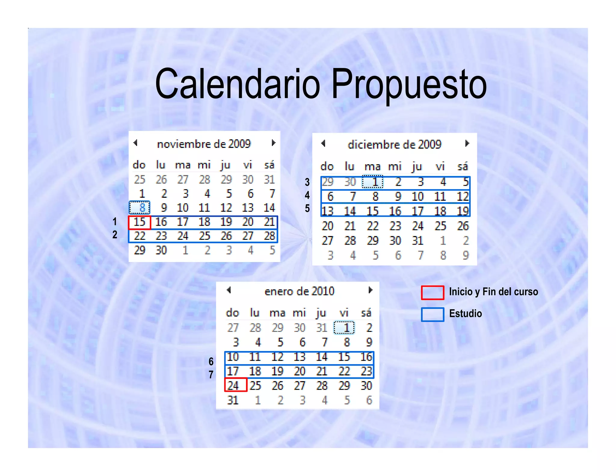 El documento presenta un calendario propuesto para el curso que incluye 7 semanas. Cada semana se enfoca en un tema de matemáticas, comunicación escrita, herramientas tecnológicas o estudio independiente. Incluye las fechas y exámenes propuestos para cada tema. Adicionalmente, propone una organización para los exámenes donde los estudiantes propondrán ejercicios y actividades para un examen colectivo que será enviado y resuelto de forma independiente.