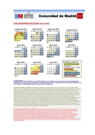 El documento presenta el calendario escolar para los años 2015 y 2016, dividiendo cada mes en semanas y marcando los días lectivos, no lectivos y festivos. Se especifica la fecha de inicio y finalización de cada periodo lectivo para diferentes tipos de centros educativos. También se indican algunos días no lectivos adicionales que pueden variar según la comunidad o municipio.