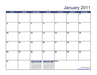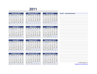 El documento presenta un calendario mensual para cada mes del año 2011, comenzando en enero y terminando en diciembre. Cada calendario muestra los días de la semana, las fechas y las notas al final de cada mes.