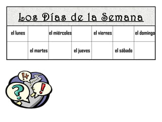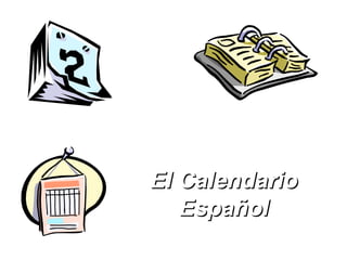 El documento proporciona información sobre el calendario español, incluyendo los días de la semana y sus nombres, meses del año, estaciones, y vocabulario relacionado con fechas. También cubre cómo escribir fechas, números, días festivos importantes y preguntas comunes sobre días y fechas.