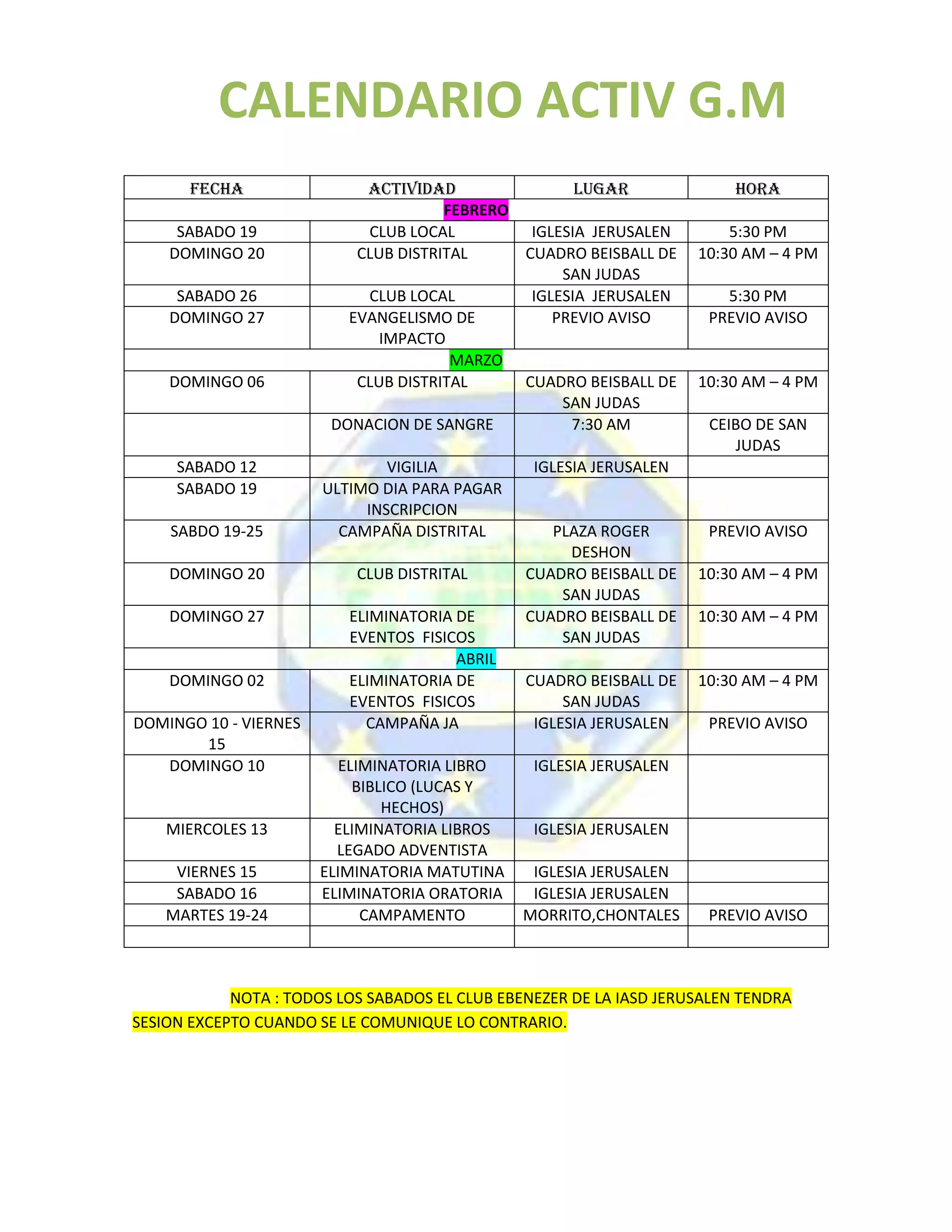Este documento presenta el calendario de actividades del Club Ebenezer de la Iglesia Adventista del Séptimo Día de Jerusalén para los meses de febrero, marzo y abril, incluyendo reuniones de club local y distrital, eventos deportivos, evangelismo, donación de sangre, vigilia, eliminatorias y campamentos.