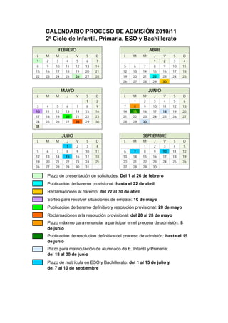 El documento presenta el calendario del proceso de admisión para el curso 2010/11 en centros de 2o ciclo de Infantil, Primaria, ESO y Bachillerato. Incluye las fechas para la presentación de solicitudes, publicación del baremo provisional y definitivo, plazos de reclamación, sorteo de empate, y matrícula.